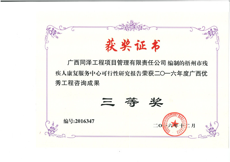 梧州市殘疾人康復(fù)服務(wù)中心可行性研究報(bào)告榮獲2016年度廣西優(yōu)秀工程咨詢(xún)成果三等獎(jiǎng)