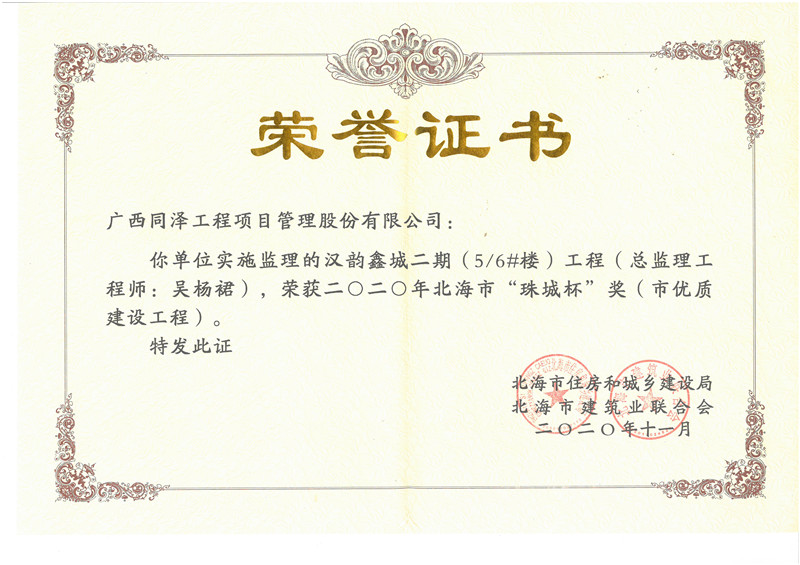 漢韻鑫城5#、6#樓榮獲2020年北海市“珠城杯獎(jiǎng)”(市優(yōu)質(zhì)建設(shè)工程)