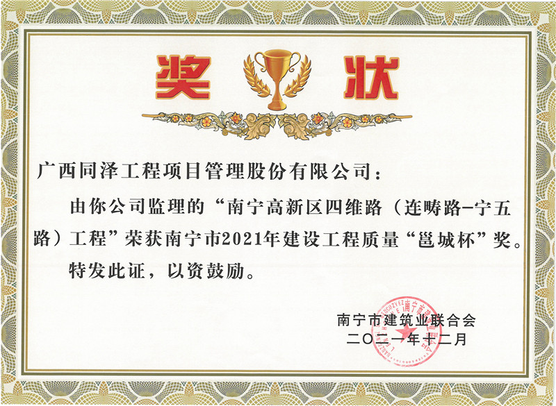 南寧高新區(qū)四維路(連疇路-寧五路)工程榮獲南寧市2021年建設(shè)工程質(zhì)量“邕城杯”獎(jiǎng)