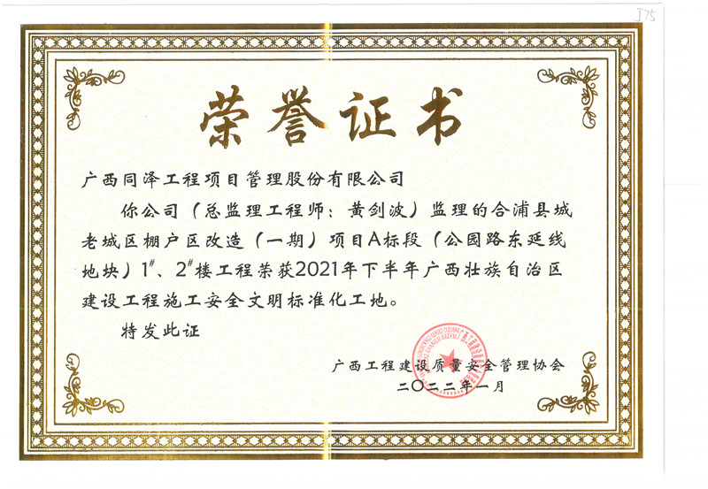 合浦縣城老城區(qū)棚戶(hù)區(qū)改造(一期)項(xiàng)目A標(biāo)段項(xiàng)目榮獲2021年(下半年)廣西壯族自治區(qū)建設(shè)工程施工安全文明標(biāo)準(zhǔn)化工地