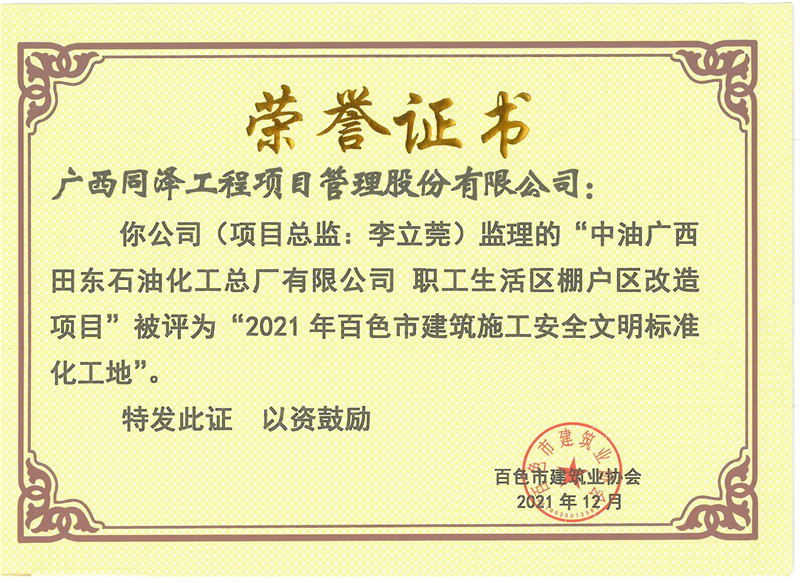 中油廣西田東石油化工總廠有限公司職工生活區(qū)棚戶區(qū)改造項目榮獲2021年度安全文明標(biāo)準(zhǔn)化工地