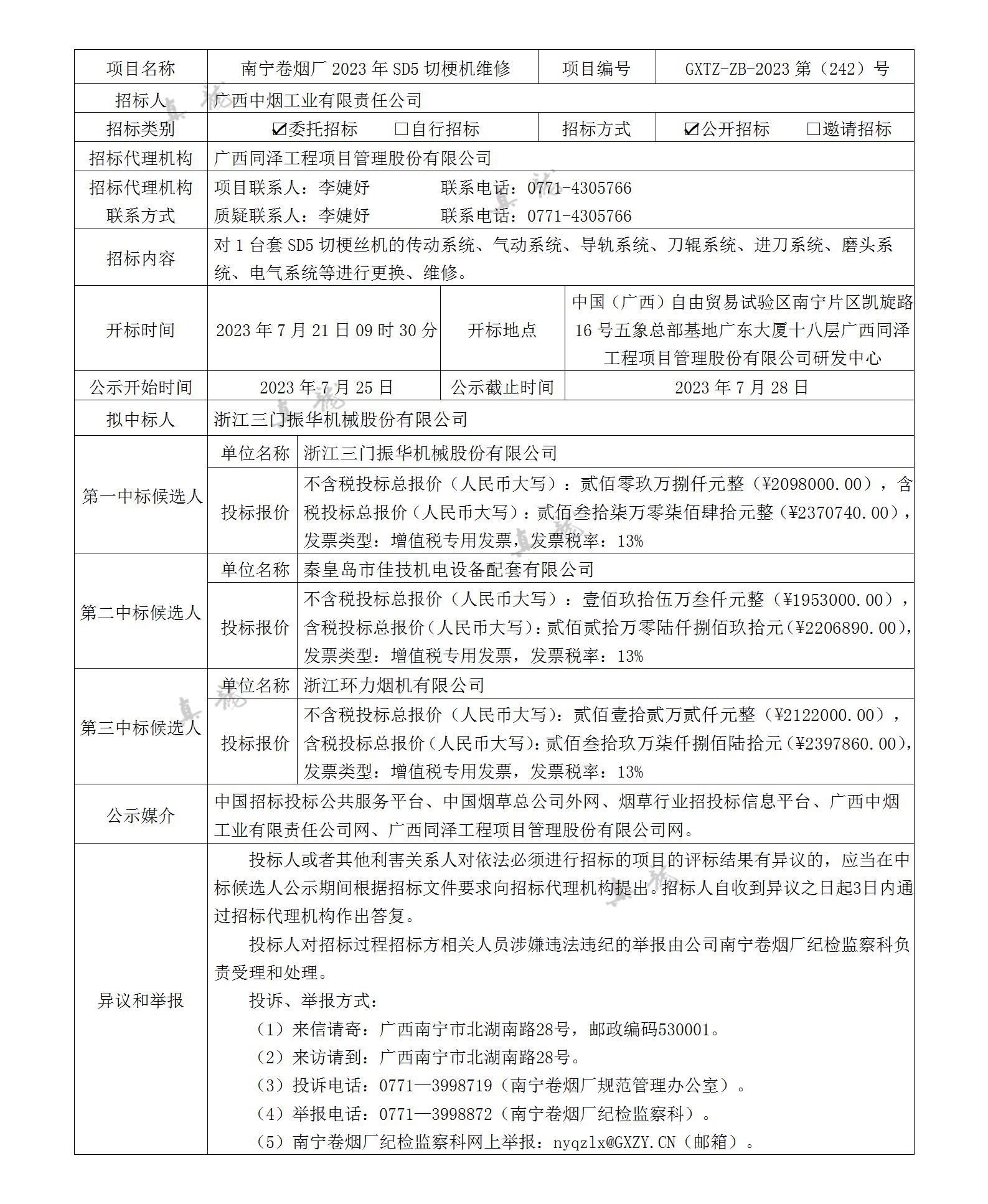 廣西中煙工業(yè)有限責(zé)任公司南寧卷煙廠2023年SD5切梗機維修(項目編號:GXTZ-ZB-2023第(242)號)中標候選人公示